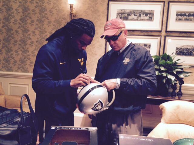 Kevin White signs a helmet for Fred Biletnikoff.
