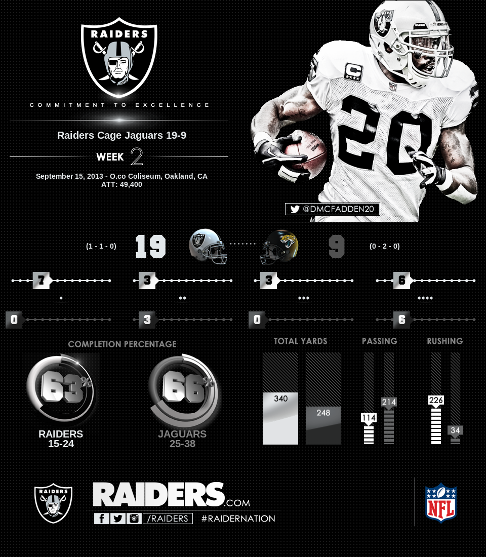 Ez a tegnapi meccs elég gyengére sikerült részünkről. Nagyon gyenge napot fogott ki Pryor, ennél jóval jobban nézett ki a Colts ellen. Most nem láttam hogy tűz lett volna benne. Nem tudom ez mitől van, de a nagy bizonyítási vágy hazai pályán, lehet rányomta a bélyegét a teljesítményére. Igaz, most kevesebbet próbált futni, ami nem feltétlenül baj, de azért az egyik fő erőssége neki a futás és ha passzolni kényszerül akkor látszik hogy baj van. Pedig volt rá mód hogy passzoljon, hiszen leginkább a futást védekezte a Jags. Volt hogy az elkapók (leginkább Moore) hagyták cserben, de volt hogy egyszerűen rosszul passzolt. Volt 3-4 olyan passza amiben benne volt a sérülés az elkapó részéről, mert olyan helyzetbe dobta oda, hogy abból nagyobb baj is lehetett volna. Egyszóval indiszponált volt. Mi lesz itt az MNF-en országos nézettség mellett...A futásaink nem tetszettek többnyire, de azért ezen a meccsen DMC-nek volt annyi 20+-os futása, mint tavaly egész évben és ez jó jel. Főként amiatt amit már fentebb is említettem, hogy leginkább futás ellen védekezett a Jags. DMC teljesítménye a fumble miatt inkább átlagos, mint jó, de így tovább és remélem lesz még pár 100 yardos meccse. Feltűnően keveset használjuk Reece-t, pedig az ilyen középre történő futásoknál hasznosabb lehetne mint DMC. Jennings is villant egyet, így azért a futójátékkal elégedett vagyok nagyjából.