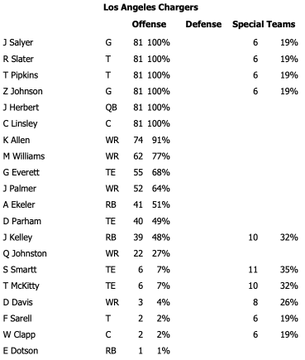 Spillert valamiért nagyon nem csípik (nagy húzás volt a drafton...), nem igazán fogják őt az aktív keretbe rakni, hacsak tényleg nincs már más.Staley azt nyilatkozta, hogy Ekeler összeszedett egy bokasérülést. Kérdés a súlyossága, reméljük pár nap pihenő és a Titans ellen már pályára léphet hétvégén.Kérdés, hogy ha Ekelernek meccset kell kihagyni, akkor ki lesz Kelley mögött a második opció.