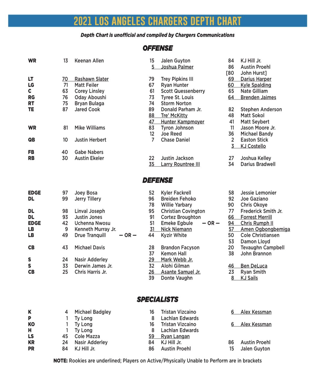 WR: Keenan Allen, Jalen Guyton, KJ Hill Jr., Joshua Palmer, Mike Williams
