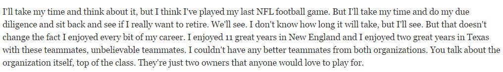 Persze. Ezért szoktak egynapos szerződést kötni.Csupán, érzelmi ill. szimbolikus jelentőséggel bír tudtommal.Vince Wilfork: 'I think I played my last NFL football game'Milyen jelentőséggel bír, hogy egy játékos melyik csapattól vonul vissza?