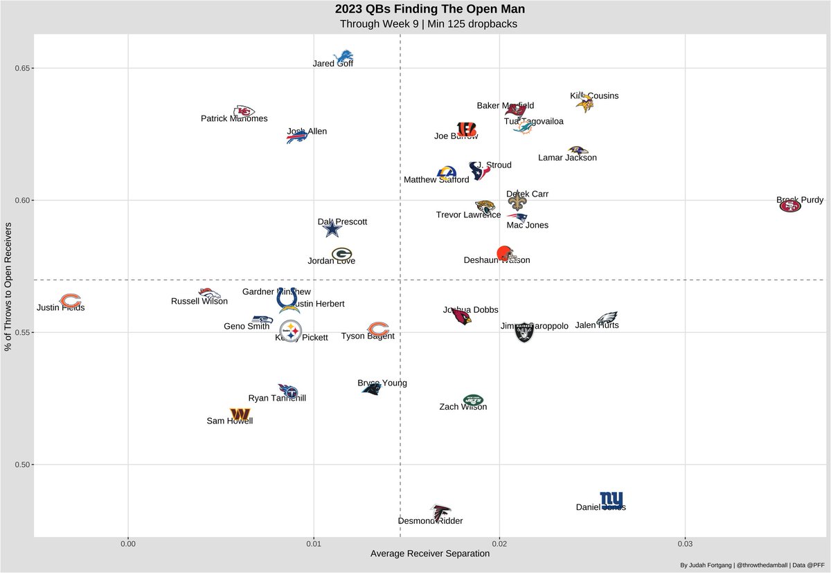 Azért ez Jonesra nézve nem egy szép táblázat. Ennek alapján a WR-ek kifejezetten jó munkát végeztek, csak nem nagyon sikerült őket megtalálniŐ nem feltétlenül... lehet èn èrtelmezem rosszul de a függőleges èpp azt mutatja, hogy a WR mennyire tudnak szeparálódni a vízszintes pedig hogy ahhoz kèpest mennyire talalja meg a szeparálódott WRt. Na most nekem ebből az jön le, hogy szegény Jonesnak nem sok szeparálódott WRe volt ès ahhoz képest a vízszintes skalán elèg pozitív tartományban van. Így kell nèzni pl Hurts játèkát is aki olyan szűk helyekre dobja be hogy csak na.
