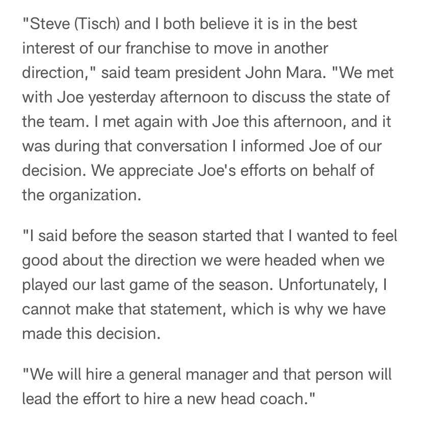 John Mara: "I said before the season started that I wanted to feel good about the direction we were headed when we played our last game of the season. Unfortunately I cannot make that statement, which is why we have made this decision.”