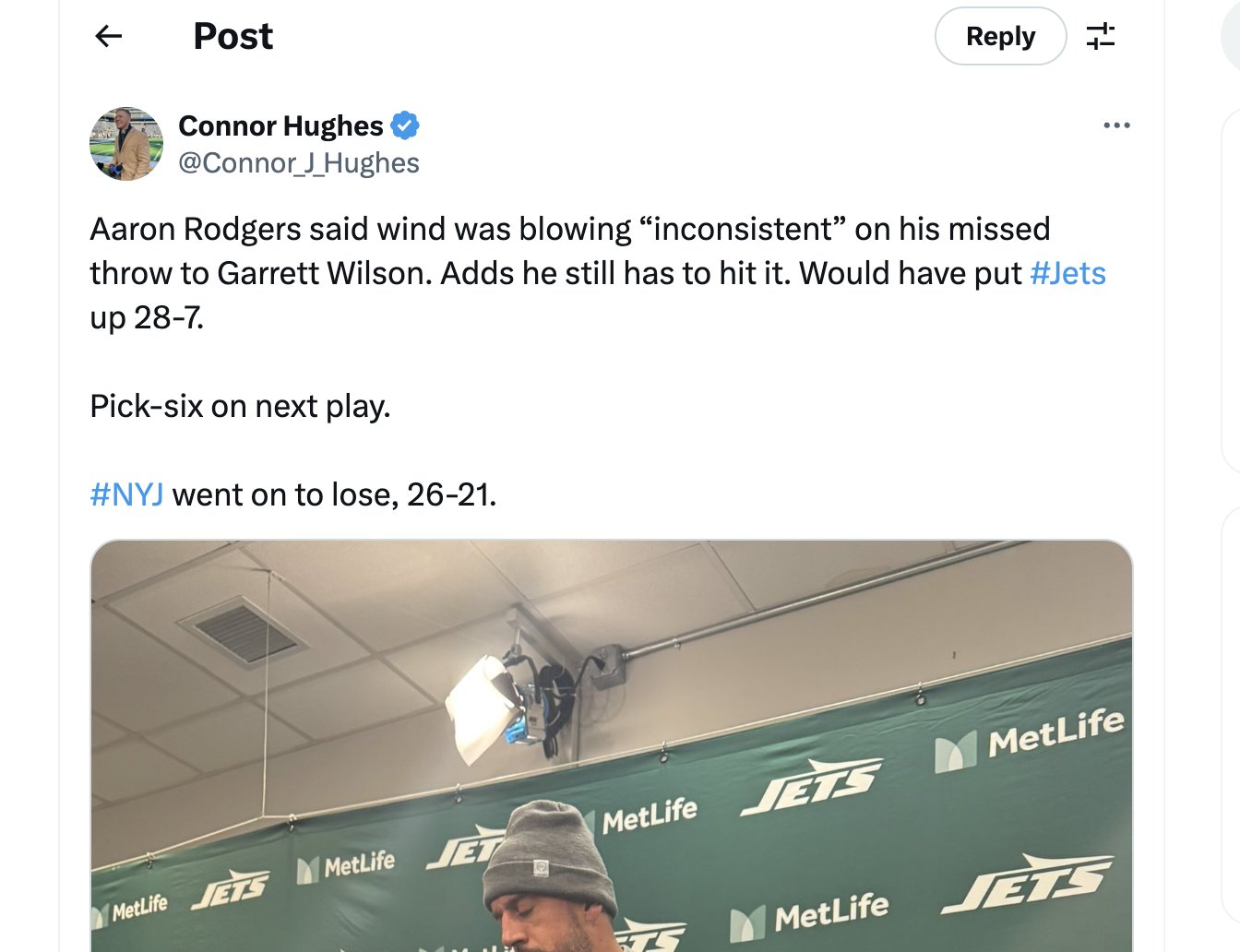 #Seahawks Leonard Williams on #Jets Aaron Rodgers missing an open WR before throwing a pick-6 to him.