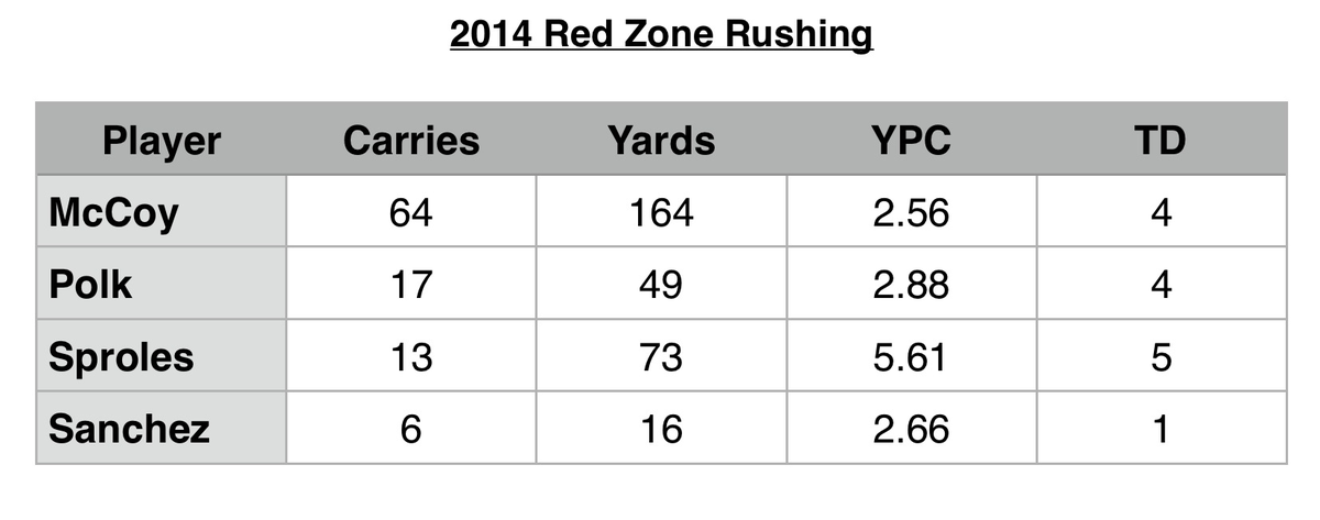 Eagles' 2014 red zone (25yd-Goal Line) rushing stats. Sproles was the most effective red zone RB
