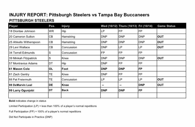 Van ennyi ember a PS-ből?Mondjuk azért eléggé ritka, hogy az első három CB és a kezdő FS is kiesik. No és a kezdő SS is sérülésből jön vissza. Persze ilyenkor van lehetőség bizonyítani mindenki másnak és ilyenkor van az, hogy az O-nak kell mennie, nincs mese.Minkah, whiterspoon, sutton, wallace, muth, leal OUT, remélem nem hagytam ki senkit 😕Ja, ez borzasztó. Egyrészt nem fogja befolyásolni szerintem a meccs eredményét, másrészt nemtom ki fog CBt játszani