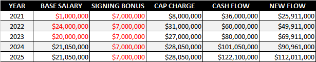 Garett szerződésében a "lényeges" a 43,5 millás aláírásnál garantált tartalom (ami az aláírási pénz és a teljes 2021-es kereset volt), és a "trükkös" 2022-es év, amely rögtön a 2021-es év kezdetén garantáltá válik. Így nagyjából emberünk tuti biztosan 61,4 millát hazavihet. 2023-ban jelenik meg egyáltalán a base salary, ami nagyjából 20 milka átlagban minden évben, vagyis nem növekszik, ami szokott lenni a csalóka az átlagos fizu számításánál.