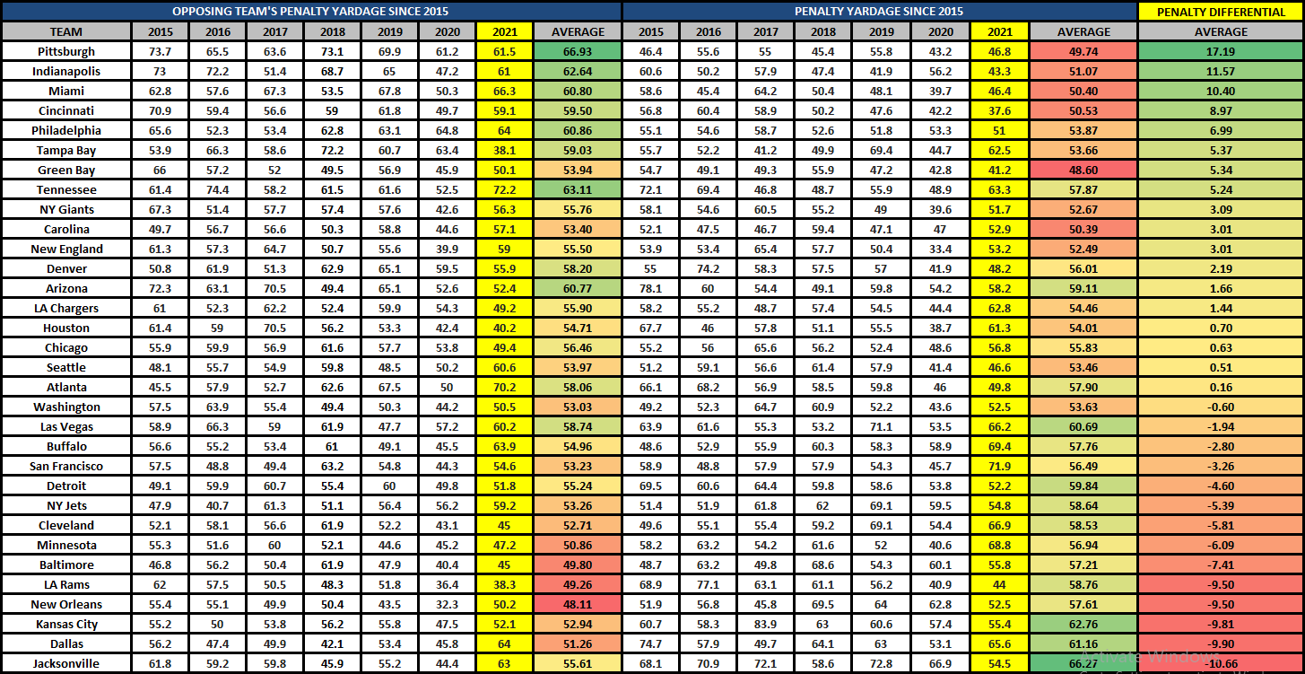 A mellékelt táblázat azt mutatja, hogy 2015 óta minket "szeretnek" a legjobban a bírók. Bár azt nem tudom, hogy mi lenne, ha mondjuk 2014 óta csinálnák, de gondolom a hétvégi mérkőzés, tényleg gusztustalan bíráskodása után a táblázat összeállítója nagyon akart bizonyítani valamit:Az is tény egyébként, hogy jó ideje már nem a kemény tökös szerelésekről híres ez a D sajnos. A CB-ink meg annyira szarok, hogy alig van ellenünk DPI, mert nem érik utol a WR-eket. Inkább az OL, aki a sok yardot hozza, mint negatívum.