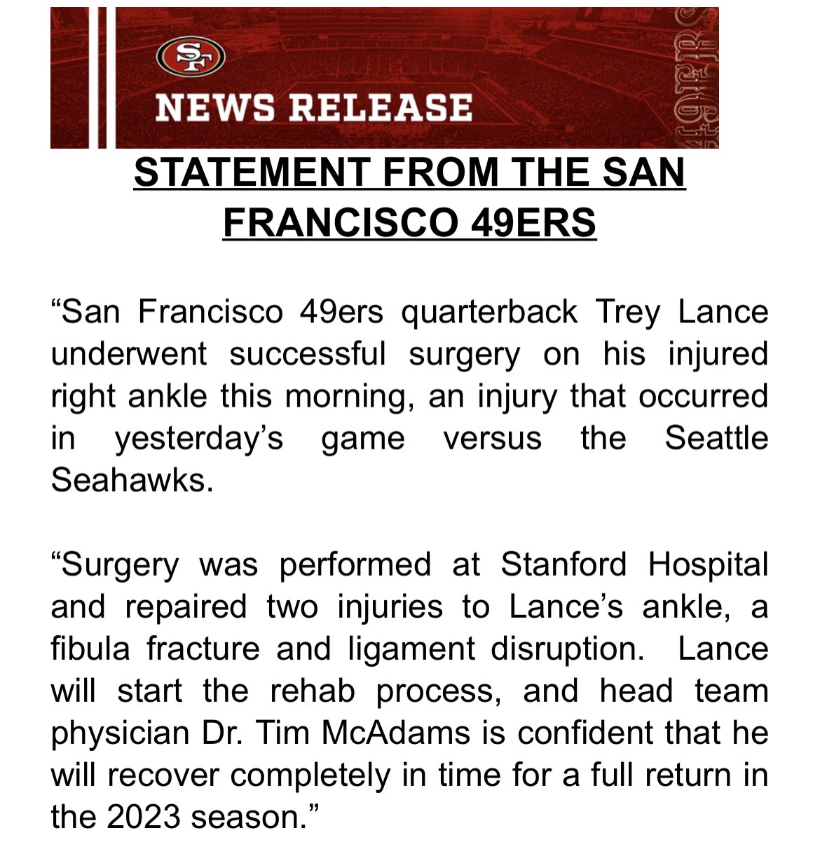 49ers’ QB Trey Lance suffered a significant ankle injury today that is expected to require surgery that likely will end his season, per source.