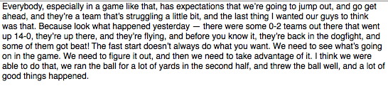 twitter.com/FieldGulls/status/648971883023470592Hawks fórumokon még táblázatot is kreáltak és bemutatták számszerűen a lassú kezdéseinket. Nyilván van benne valami, hogy a staff így akar információt kicsikarni, és biztosan sikeres is ez a stratégia részben, mert a második félidőben mindig jobbak vagyun, mint az elsőben és nem csak saját magunknál, de az ellenfélnél is -kevés kivétel-, de ez nem azt jelenti, hogy az elején nem akarunk pontot szerezni, hanem maximum azt, hogy az elején nem terítjük ki minden lapunkat, de ettől még azt az inside futást, ha első félidő ha nem, végre kellene hajtani. Nem hiszem, hogy Britt meg Sweezy azert engedik, hogy seggre ültessék őket, mert abból információt kapunk.