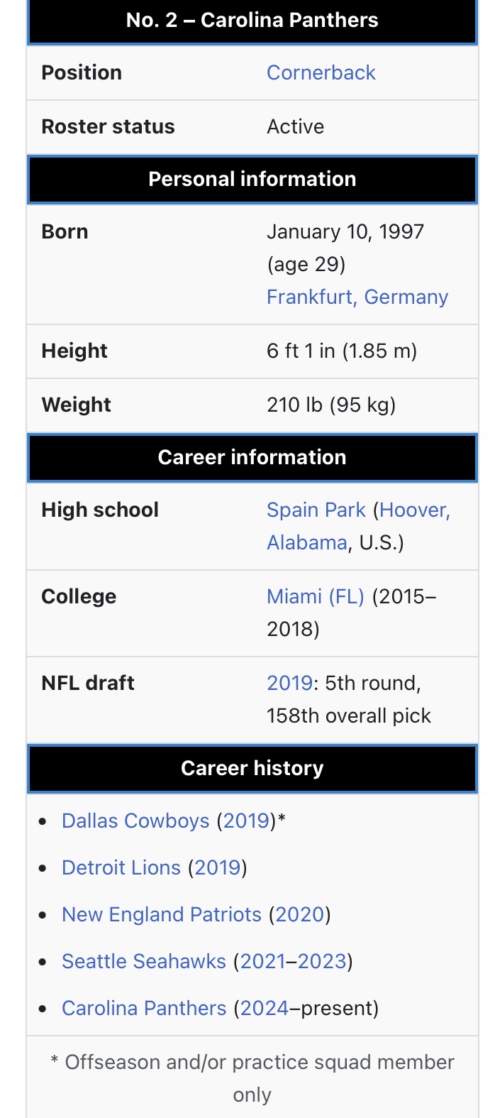 Jackson a 2-es, nem?Lehet valamelyik szulo/nagyszulo is nemetA Panthers 2-es számu játékosa.nekem is Lancastert ír, pont a wikipédia. Biztos jó embert nézel? 😊Nem biztos, de a wiki ezt írja, én meg nem tudok jobbat.biztos? May 17, 1995 (age 30)scottnak Is sok esze van, kb négyféleképpen csaphatta volna telibe ugyanennyi erővel adamset. neki a nyilván totál szabálytalanra esett a választása xd miért van germán sticker a sisakján?Frankfurtban született.