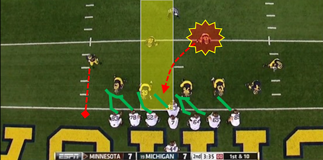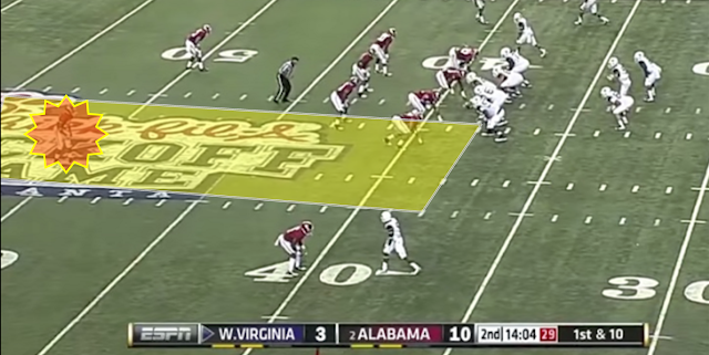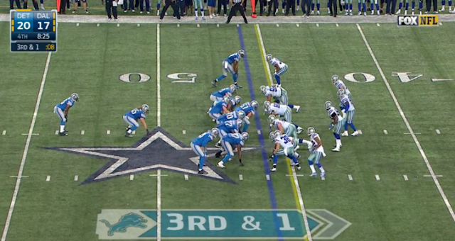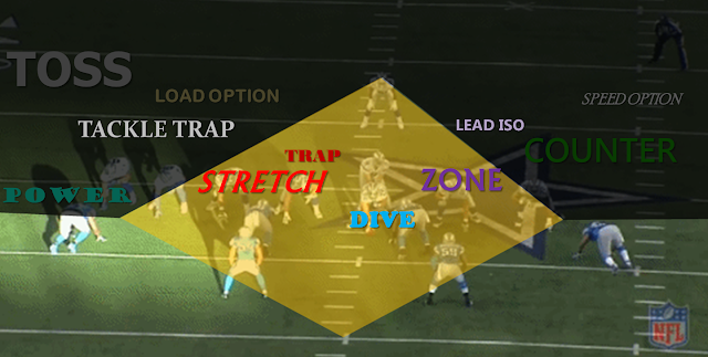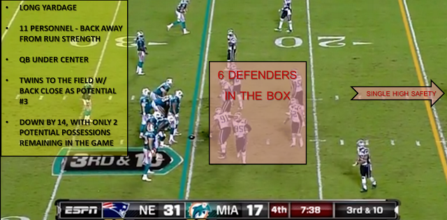 Megjegyzések a képen (fentről lefelé, majd balról jobbra haladva): sok yardos szituáció; 11-es személyzet [1 RB, 1 TE] a futás erős oldalától távol; az irányító a center alatt; két WR párban, közel a futó potenciális harmadikként; 14 pont hátrányban, vélhetően csak két labdabirtoklásra való potenciális idővel – 6 védő a boxban – söprögető mélyen egyedül