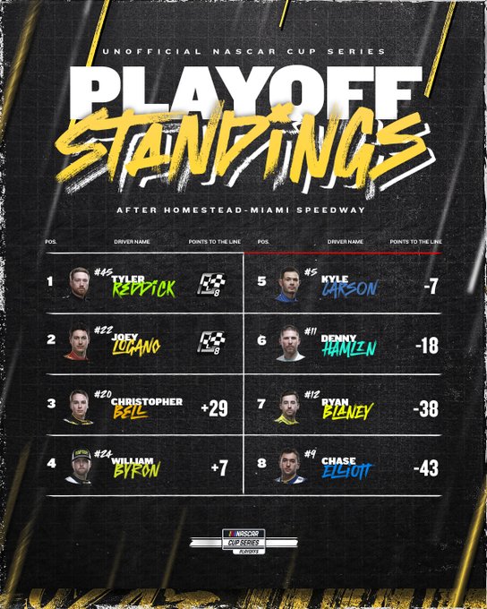 Ez a mai Homestead-Miami kurva nagy és szórakoztató volt, kár, hogy a végén Larson elkúrta, és így Reddick a semmiből vissza tudta hozni. Nagyon sajnálom, hogy így nem Blaney nyert, de ritka izgalmas verseny volt.