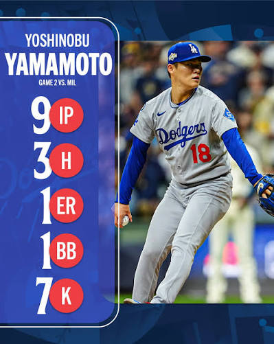 Yamamoto első dobásából HR-t ütött a Brewers, aztán roló le, és complete game, 110 dobásából kettőt tudtak egyáltalán megütni, több mint 80 dobása jó volt, 3 órán át csak rezzenestelen arccal dobálta le az alapszakaszban legproduktívabb csapat ütőit, mintha ez lenne a világ legtermészetesebb dolga.
