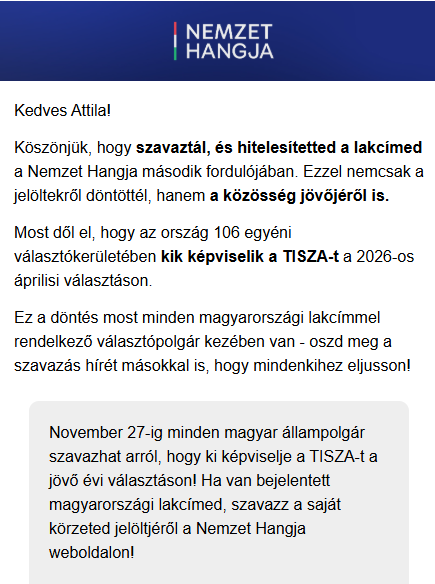 Sikerült 😊bízom benne hogy így lesz, próbáltam regísztrálni de sajnos nem megy a server, vagy túlterhelt (reggel óta)Nem lehet, hogy ez inkább csak egy közvéleménykutatás? Egy egálközelinél majd a vezetés megmondja, ha meg valaki nagyot nyer, akkor a tömeg szava dönt?telex.hu/belfold/2025/11/25/magyar-peter-tisza-part-jeloltallitas-eredmenyekkiváncsi vagyok ha nem Péter jelöltjére jut majd több szavazat a 2.fordulóban belenyúlnak e az eredménybe