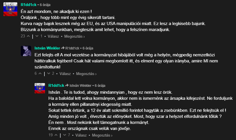"Orbán Viktor vezérletével visszatértünk a cocializmusba, ahol mindennapos a hiány, ismét a dollár a mumus, a hanyatló nyugattal harcolunk, az orosz érdekeket szolgáljuk ki, a nyomort pedig a kulturalis fennsőbbrendűségünk illúziójával fedjük el. A rendőr pedig többet keres, mint a tanár."¯\_(ツ)_/¯