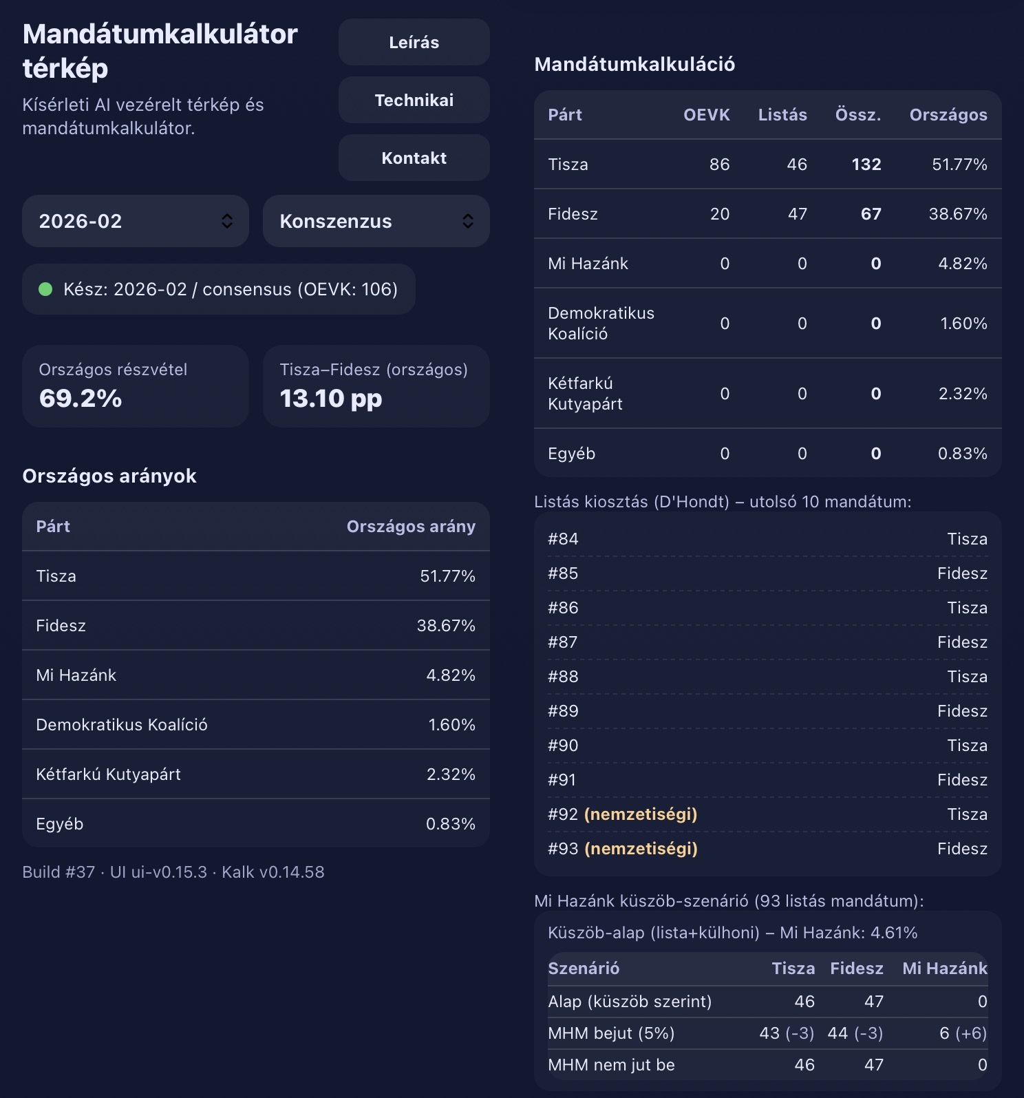 Vizualizalom a linked:Akkor mit szólsz ehhez?Szerintem egy Kutyaszavazó szempontjából a legracionálisabb és legpragmatikusabb döntés inkább az hogy nézze meg, hogy hogy áll az adott OEVK-ban a két nagy párt, pl. itt: taktikaiszavazas.hu/ (itt 37 csatatér OEVK van -- ahol 5%-k a különbség a Tisza és a Fidesz jelölt között --, jóval pozitívabban látja a Tisza esélyeit több OEVK-ban is, mint amire én tippelnék), és ha azt látja, hogy -- mivel ez az oldal is csak előrejelezés, jobb az óvatosság -- az ő OEVK-jában 10% plusszal az egyik vagy másik párt vezet, akkor egyéniben szavazzon nyugodtan a Kutyák jelöltjére, ha pedig 10% alatt van a különbség, akkor pedig egyéniben a Tiszára.az oldal szerint Tisza 68 oevk-ban nyer egyéniben, a Fidesz 38-ban. eléggé wishful thinkingnek érzem. anno a 2018-as választás előtt nézegettem komolyabban ezt az oldalt, akkor is túlbecsülték az ellenzék eredményeit.