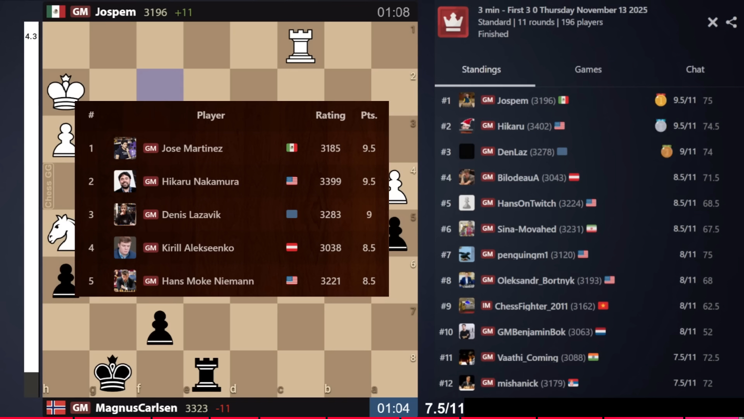 Mókás adalék, hogy Jose Martinez (Jospem) most nyert Titled Thursday online schnellversenyt többek közt Nakamura, Niemann, Bortnyk meg Carlsen előtt (Carlsent is verve), pénteken meg tolja tovább a World Cupot Harikrishna ellen. Laza.