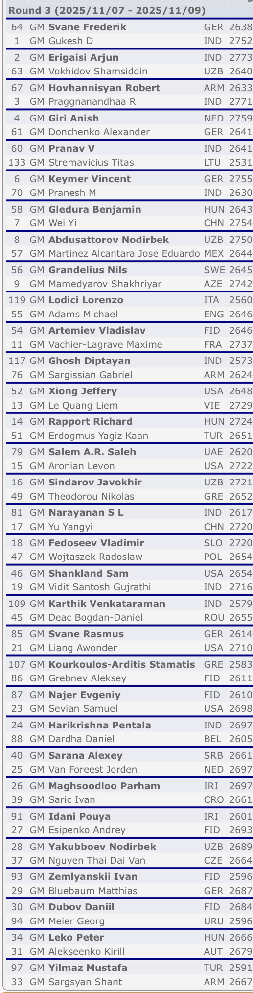 Lékó nyerésre áll világossal, a másik kettő remi lett.Nodirbek csúnyán elszúrt egy jó állást világossal, kifelé áll neki is a rúdja.