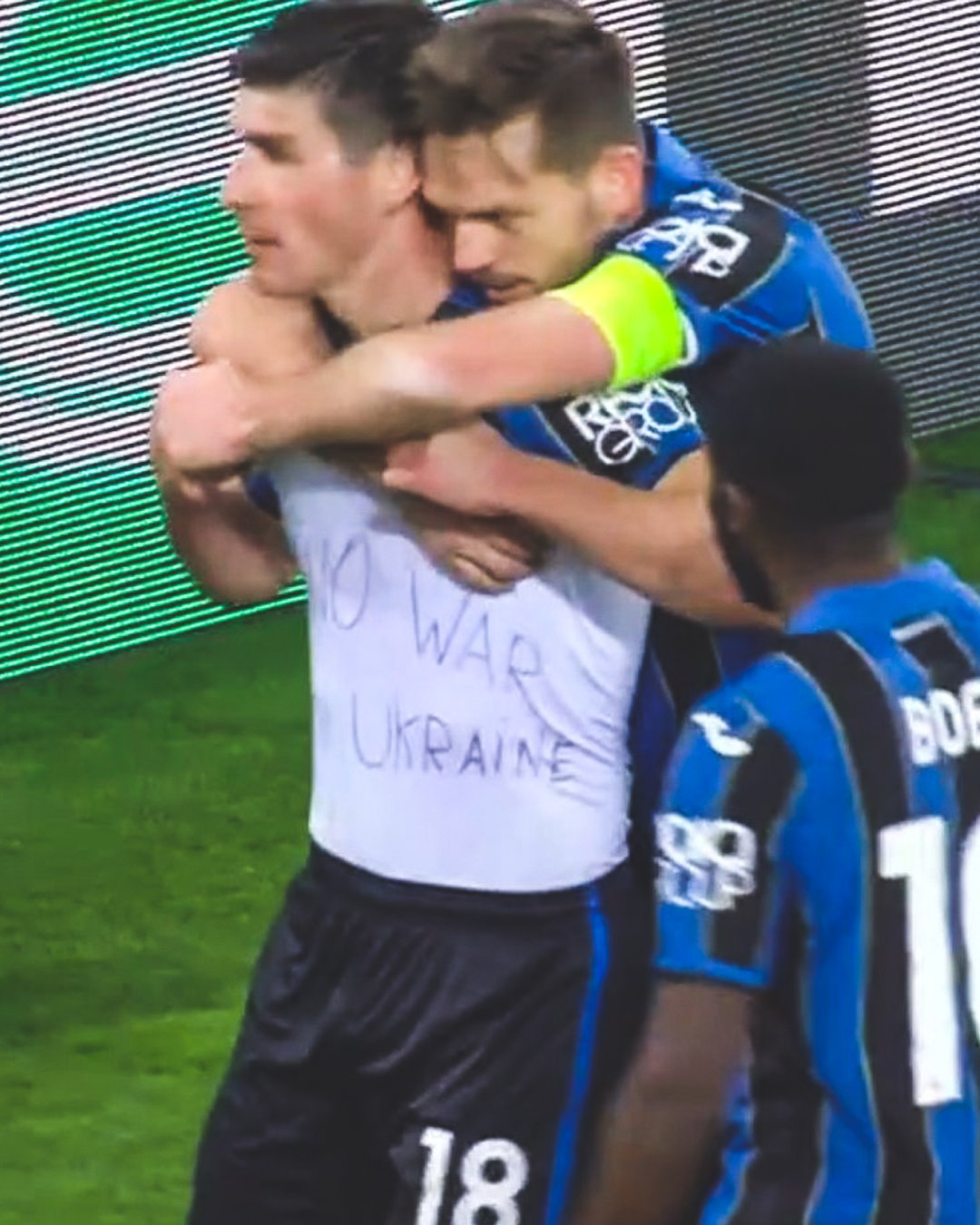 Following his goal for Atalanta, Ukrainan international Ruslan Malinovskyi revealed a shirt that read "No war in Ukraine."