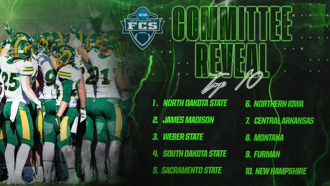 És ha már playoff, szerdán az FCS selection committee nyilvánosságra hozza a Top 10-es rangsorát 3 héttel az alapszakasz vége előtt. Valószínűleg valahogy így fog majd kinézni. 1. North Dakota State; 2. James Madison; 3. Weber State; 4. South Dakota State; 5. Sacramento State; 6. Montana; 7. Central Arkansas; 8. Northern Iowa; 9. Furman; 10. Montana State