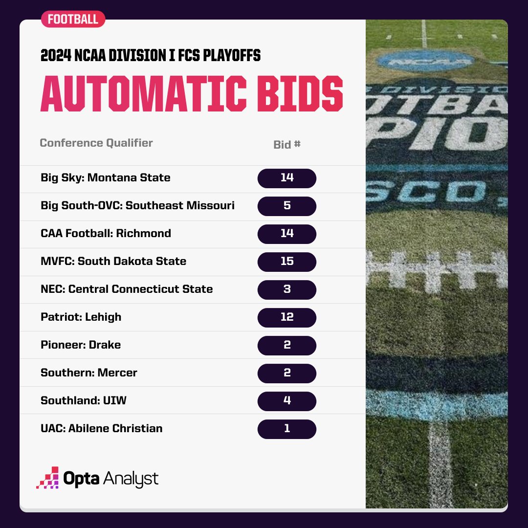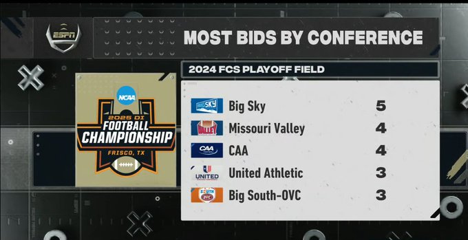 Ma Selection Sunday. Íme az a 10 konferencia nyertes, akinek nem kell izgulni amiatt, hogy ott lesznek vagy sem a rájátszásban.Érdekes lesz, ki lesz az 1. kiemelt, mivel az eddigi 1. helyen rangsorolt North Dakota State kikapott 1 ponttal a 4. South Dakotától, így a Montana State vagy South Dakota State is lehet a legjobbnak titulált csapat a mezőnyből.