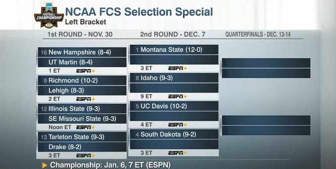 Következik: Máris megkapjuk a tavalyi FCS döntő visszavágóját, mert a 3. kiemelt (és címvédő) South Dakota State lesz a Grizzlies ellenfele. Januárban Gronowski-ék 23-3-ra kalapálták el a Montana-t a texasi Friscoban.