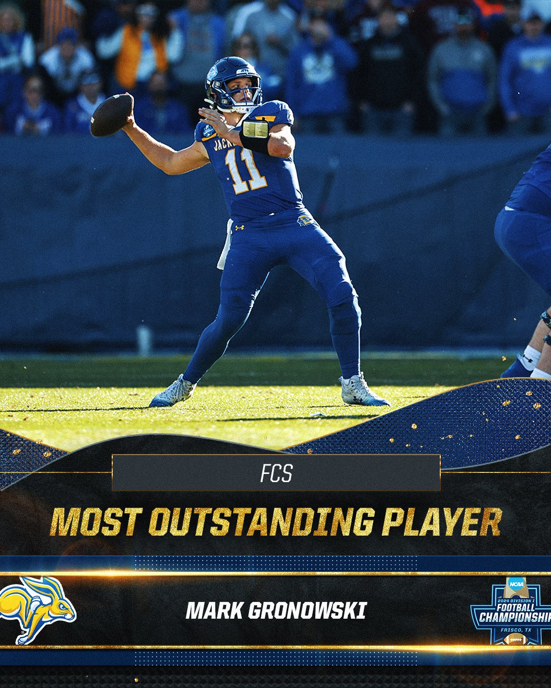 Gronowski, who’s 36-3 as a starter in his career, was selected as the outstanding player of last year’s FCS title game. This season, he was named the Missouri Valley Football Conference’s co-offensive player of the year along with his Jackrabbits teammate Isaiah Davis, who finished seventh in the Payton voting.