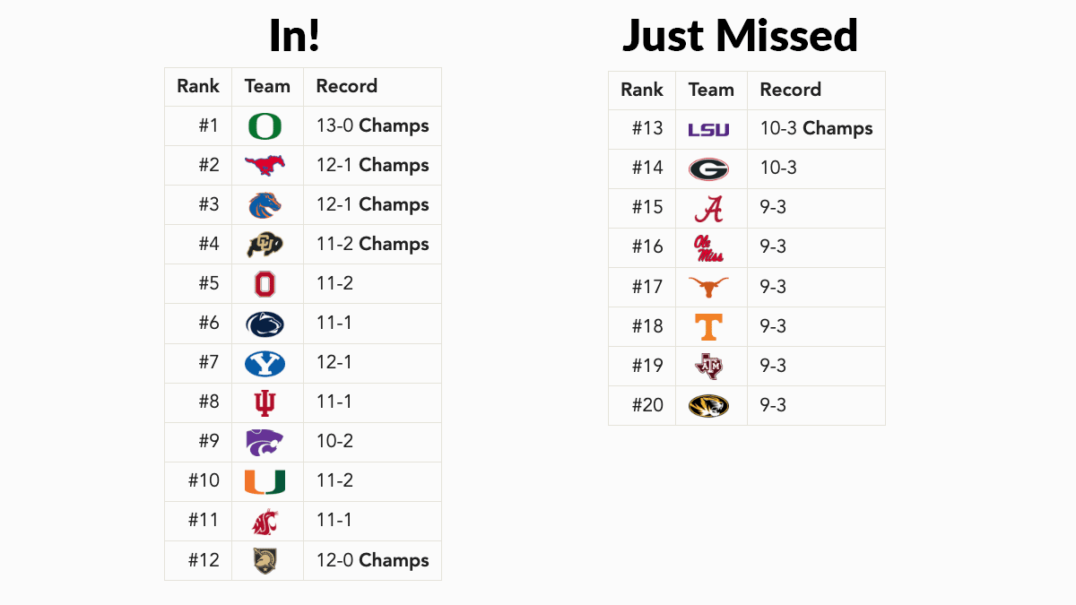 Oksa, csak így nem értem mi értelme a rangsornak. Ha a Boise mondjuk 25. lenne, és ő lenne a legmagasabban rangsorolt GO5 csapat, akkor kiverné azt aki a 12. helyen áll? Nekem ez picit vicces. Több értelmét látnám ha fixen azt mondanák az első 12 csapat van bent és kész, mindegy hogy konf győztes vagy hányadikA bracketben a legjobb 4 konfigyőztes lesz az 1-4 kiemelt és lesznek bye weeken.Lehet én maradtam le valamiért, de ha az OSU 2. ként van rangsorolva itt miért 5. nek szerepel? De BYU, Texas,Miami szintén nem ott van ahová rangsorolták őket. És a Georgia 12.nek van rangsorolva akkor ők miért maradnak ki, és a Boise miért van bent mikor 13.?The updated CFP bracket projection has arrived‼️