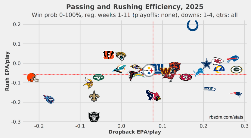 Több éves távban nem is lehet, de ha csak a most tavaszi offseasont nézzük ahol a épületben mindenki az állásáért tepert, nehéz megkerülni. És szerintem van egy szmbolikus jelentese annak, hogy a skála egyik vegen a Buff, másikon a Cin szerepel.Én se így építenék csapatot, de mindent Higgins újraigazolására húzni biztos nem lehetEz egy (nem) kicsit demagóg értelmezése egy arbitráris statnak, a Bengals ofal és futók húzzák le, nem a wr-ekMinden idők legnagyobb WR fizuja kiosztása után (Chase) valószínűleg Higgins fizujából és az érte kapott pickből tudtak volt támadófalat építeni vagy akár tight end állományt erősíteni, nem tették. Csak azért nem tökutolsók, mert Flacco elkezdte pillanatok alatt kiosztani a labdákat az elmúlt meccseken ami felhúzta kicsit az OL értékelését.