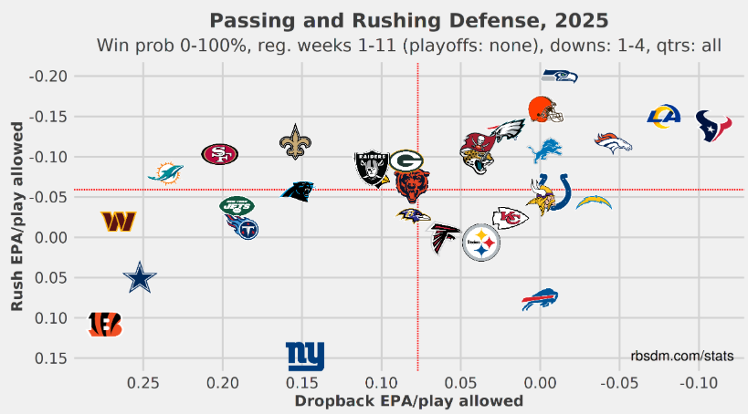 Szar a Bengals O fal, de az a védelem történelmi mélységekbe süllyedt a szezon közepére, inkább az az egység miatt nincsenek PO közelben már. Szerintem két ilyen egymást tökéletesen kiegészítő X és Z elkapót kár lett volna nem megtartani, ha van egy szuper pontos és a zsebet kiválóan érző Burrow is a csapatban. Persze attól még nem kéne őt összetörni hagyni és a védelem sincs ingyen, de a botrány szar draftokat inkább hibáztatnám mint Higgins szerződését.Ez egy (nem) kicsit demagóg értelmezése egy arbitráris statnak, a Bengals ofal és futók húzzák le, nem a wr-ekMinden idők legnagyobb WR fizuja kiosztása után (Chase) valószínűleg Higgins fizujából és az érte kapott pickből tudtak volt támadófalat építeni vagy akár tight end állományt erősíteni, nem tették. Csak azért nem tökutolsók, mert Flacco elkezdte pillanatok alatt kiosztani a labdákat az elmúlt meccseken ami felhúzta kicsit az OL értékelését.