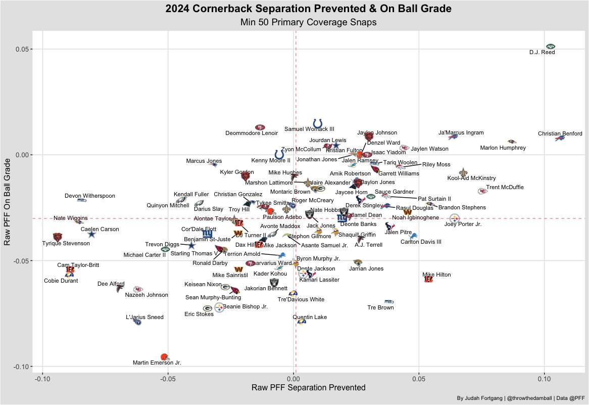 Köszi, tudtam hogy van itt köztünk pff-es szaki, csak nem emlékeztem ki 😁👍A vízszintes tengelyen az a grade átlag látható, amivel az általa fogott receiver separationjét értékeljük abban a pillanatban, amikor a route eléggé kiforrott. Man coveragenel az esetek felében kb megállapitható separation vagy tight coverage és ennek megfelelően kap értékelést a védő és az elkapó is. Zónában ritkább, ott legtöbbször 0 értéket kapnak mindketten. Ezzel egy teljesen külön stáb (köztük én is) foglalkozik, ami minden egyes matchupot értékel.On ball grade, gondolom kb hogy mennyire követi a labdát, de a jóisten sem igazodik ki pontosan a pff metódusain...Mi az a ball grade?