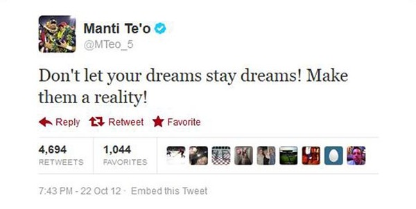 "In an interview with ESPN for "College GameDay" on Oct. 2, Te'o said Kekua's last words to him were "I love you." He also said that she was "the most beautiful girl I've ever met."