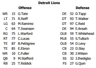 - Matthew Stafford: igaz sok időt nem tölthetett a pályán (összesen 2 drive), de továbbra is igazi vezérként viselkedik. Magabiztosan áll a fal mögött, dobásai pontosak (a múlt heti tökéletes mutatók után ma 8 passzából 6 volt sikeres), remek lábmunka, a "hírhedten" csúnya oldalpasszoknak nyoma sincs.