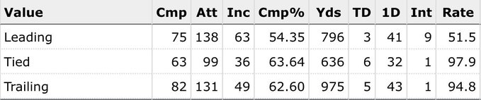 Lawrence has 0 INTs when trailing this season. Seven of his INTs have come with a lead. pic.twitter.com/5sjBjw25LG