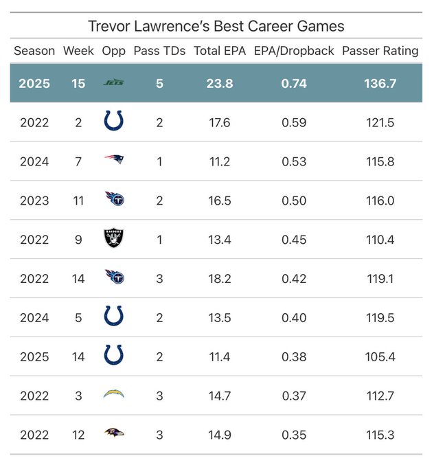 pretty easily the best game of Trevor Lawrence's career by the numbers https://t.co/myKRsrQIYU