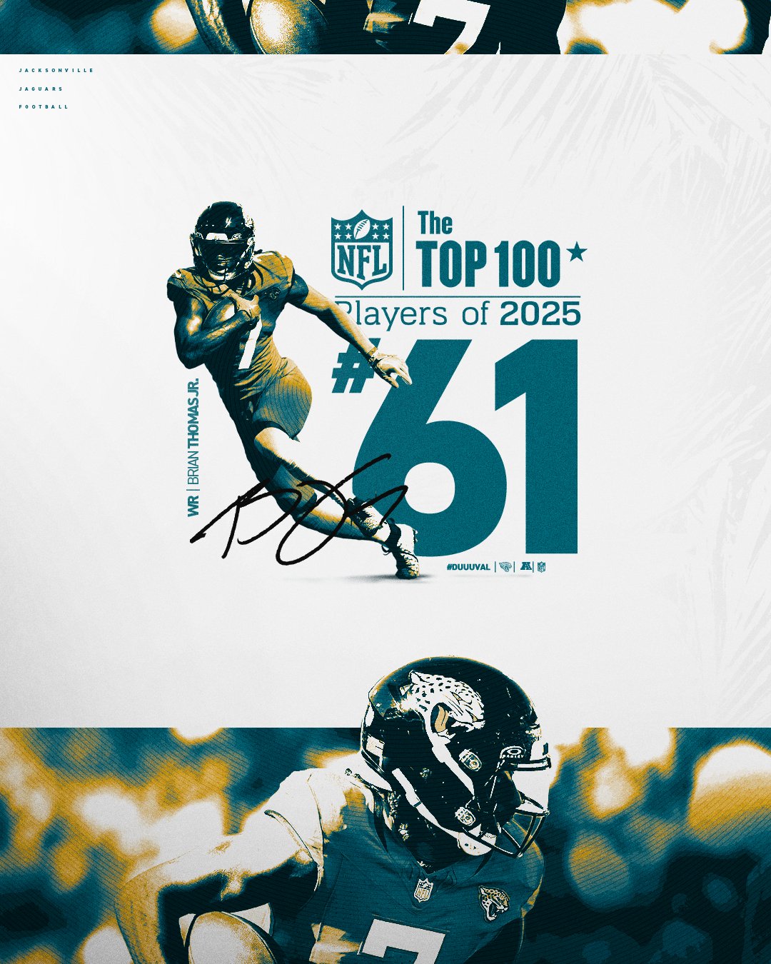 NFL Top 100 Players of 2025:@Jaguars WR Brian Thomas Jr. earns the No. 61 ranking! @NFLFilms pic.twitter.com/tDngwMvv5M