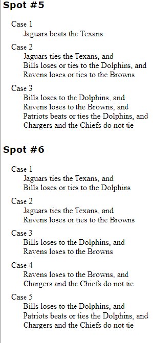 Nem , mert Stöki forgatókönyvében 2× szívnánk a Titanstől, övek lenne a tie braker, és maradna nekünk az 5. kiemelés és sanszosan egy túra a Chargershez.Igen, tényleg érdekes, hogy a "negyvenkilencesek" lehetnek a mérleg nyelve az AFC South-ban, pedig az lesz úgy néz ki.ha jol szamolom akkor tobb mindenen mulhat, mert ugyan az lenne a merleg es 1-1 egymas kozt.