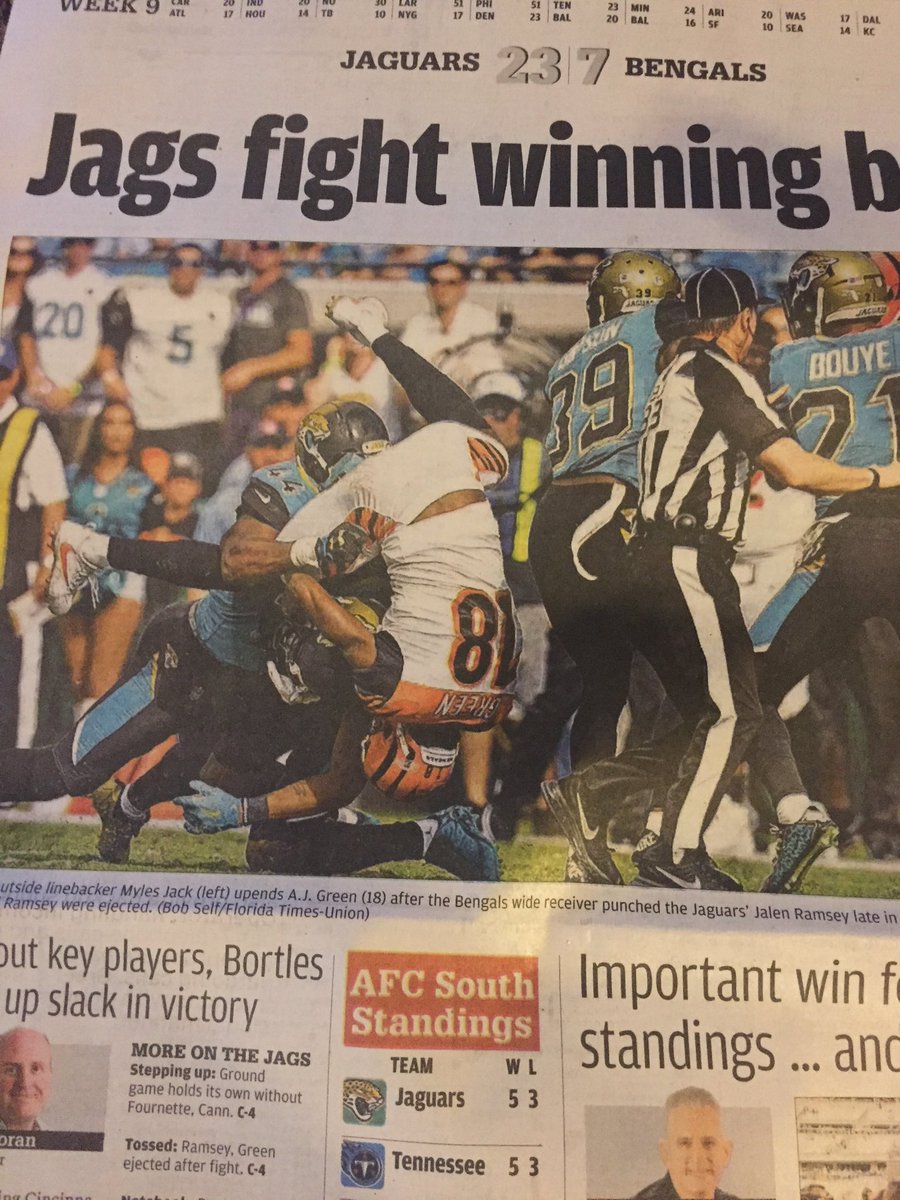 7 ember/csapategység ami jól teljesített a mai meccsen. Érdekes döntés az 1. helyezett személye.www.bigcatcountry.com/2017/11/5/16609990/7-jaguars-players-who-stood-out-in-23-7-win-over-bengals
