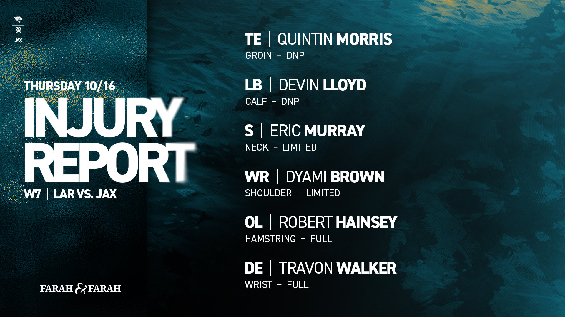Lloyd helyén Ventrell Miller lesz majd. Morris helyettese pedig Jordan Akins lehet, akit ma igazoltunk le a practice squad-ba. A múlt héten igazolt TE Qadir Ismail került ki a gyakorló csapatból.