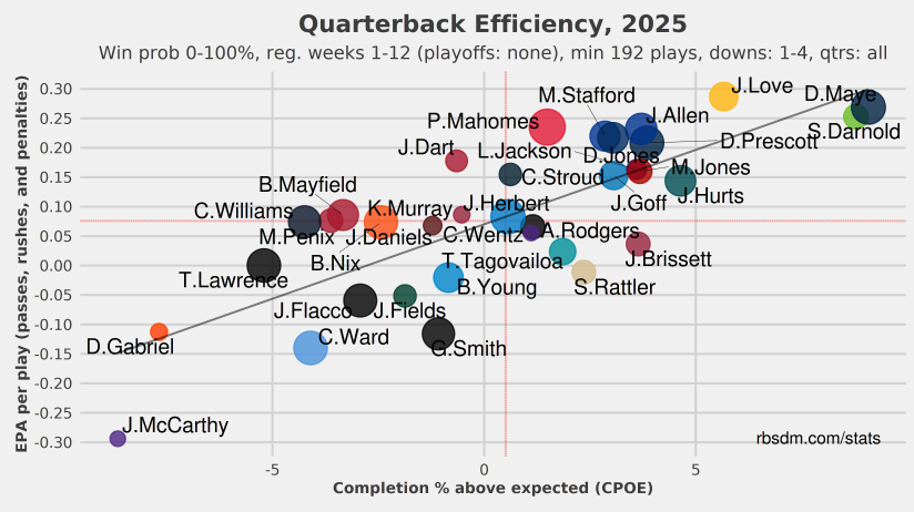 Itt szerintem offseasonban blockbusterre kell számítani, vagy az egyik elkapót cserélik el extra munícióért falakat tákolni Mac Jones/Rattler elé (KOC-hoz Geno Smith illene még, de nem tudom vele mizu), vagy kiszórnak 2-3 elsőt egy potens irányítóra. Ami kizárásos alapon felcsere, ha Lamar nem kér már idén cserét. Egy Mendoza szerintem elketyegne itt, majdnem 2 méter magas, KOC felépítheti jó Goffosra. McCarthy nem fog még egy dobást kapni. Utólag KOC-ra kellett volna hallgatni, elvinni Rodgerst, és JJMekivel megmalmozni valami világtalan csapatot aki látatlanban ad érte jó picket. Amíg Flores nem lesz HC próbálkozni kell, utána nehezebb lesz.En azert meg megneznem JJ-t a hawks vedelme ellen. Ha ezen a meccsen jol jatszana meg lehetne rola beszelni a jovoben.