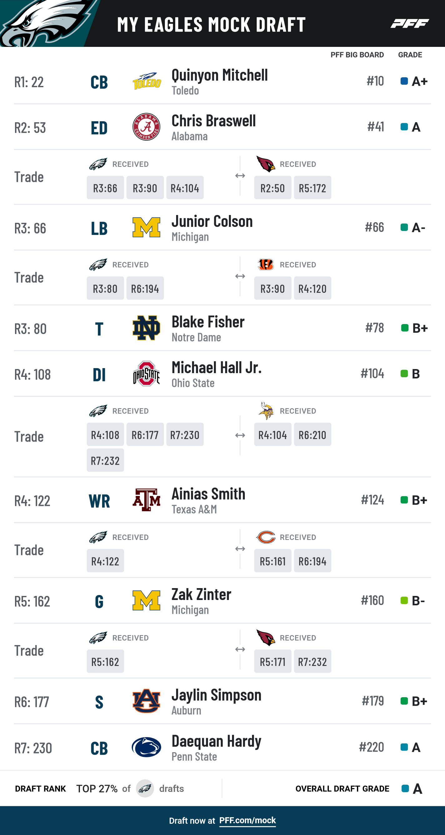 2021 draft has a chance to be right up there. DeVonta Smith and Landon Dickerson are franchise cornerstones. Milt Williams is worth a 2nd contract. Z. McPhearson, Gainwell, Marlon T and Patrick Johnson are good role players. https://t.co/0eGEYzaWg9