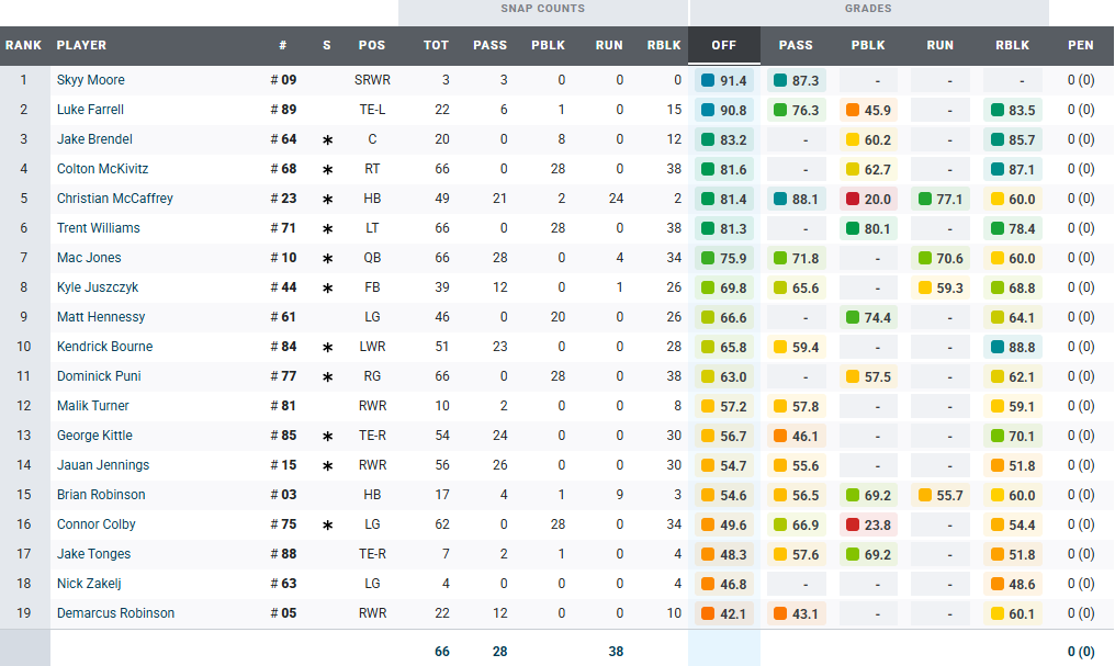 nagy pacsi Sanyinak, hogy végre elkezdtünk középre is futni, és Kittle itt a meg nem énekelt hős. iszonyat blokkokat osztott, vele ismét megy a futás. gondolom jövő héten menni fog felé passz is.