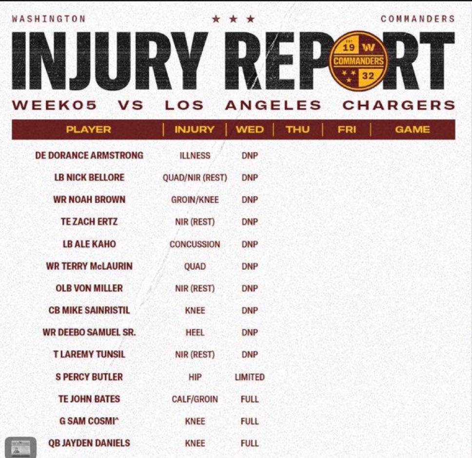 Commanders QB Jayden Daniels has a knee injury that has his status for Sunday’s game vs. the Raiders in question, per league sources. The injury is not believed to be serious, but it remains uncertain whether Daniels will be able to play Sunday.