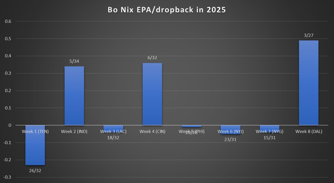 Nix presnap és clutch képességei eddig is magasztalva voltak (általam is már draft processtől fogva), de a pontatlansága számisztikailag kioltja a dropokat, mert az elkapók ezzel jelentősebben vannak hátráltatva. Sokkal több miss van, mint drop. Ami elit irányítónál is így van, viszont itt jön be Nix ezen statisztika ligaszintű helyezése (bottom 5 pontosságban). Franklin most a legkönnyebben feláldozható elem, de nem csak vele van rossz kémia szériában Nix, hanem kollektíven mindenkivel, csak ők szopatják kölcsönösen legjobban egymást, mert Troy dobja le a legtöbbet, cserébe neki megy el a legtöbb big TD-je/játéka azon, hogy a mély szeparációja nincs megdobva.