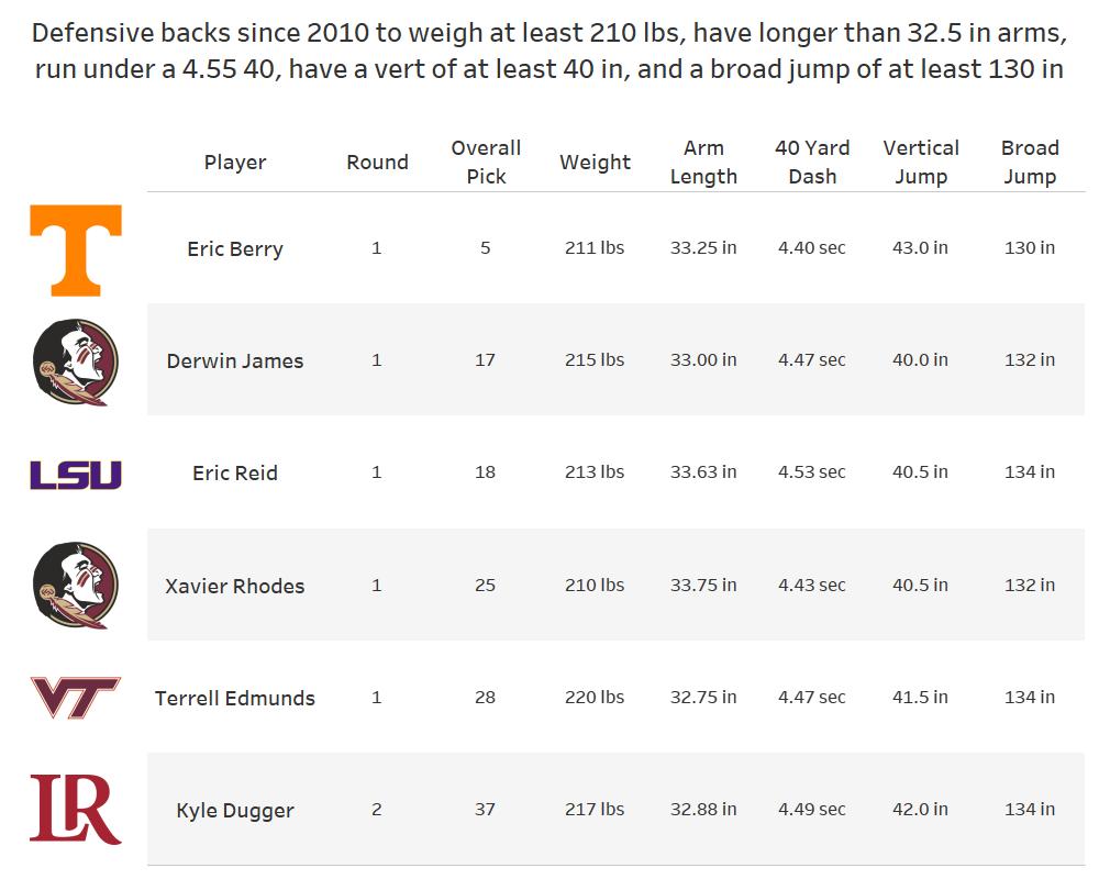 Szóval nekem két aggályom van vele kapcsolatban. Három évet játszott egyetemen, ami másokkal összevetve (snapszámra lebontva) ez inkább az általános négy-öt évet jelent, ezért kérdés a teste mennyit bír még el, van-e benne 8 kiemelkedő év, vagy csak 3-4 elit évet tud lenyomni a profik között és utána szépen visszaesik, azért ez sem mindegy. Ez a kisebbik gond. A másik aggályom, mennyire lehet meggyőzni arról, hogy ezt a két posztos dolgot felejtse el. Nem azt mondom, hogy meccsenként ne álljon be támadó oldalra mondjuk 10 snapre, de 30-40%os (vagy még több???) extra snapterhelés totálisan őrültség. Ha valami utóbbihoz hasonló van a fejébe és emiatt hisztizni fog az megint nem fog túl sok hasznot hozni. Meg lehet-e értetni vele, hogy bőven jobban jár ő is, ha 100%osan CB posztra koncentrál és ebből próbálja meg kihozni a maximumot, mint azzal, ha megosztja a figyelmét és mondjuk csak 70%-ban fejlődik CB ként, WR-ként meg mondjuk 40%-ban. Papíron értem, hogy az utóbbi jobban néz ki és magasabb számot hoz, de gyakorlatban én inkább a két szék közé a pad alá esést látom ebben. Nem lesz elég jó CB, a kettős terheléssel meg a strapabíróságát kockáztatja.