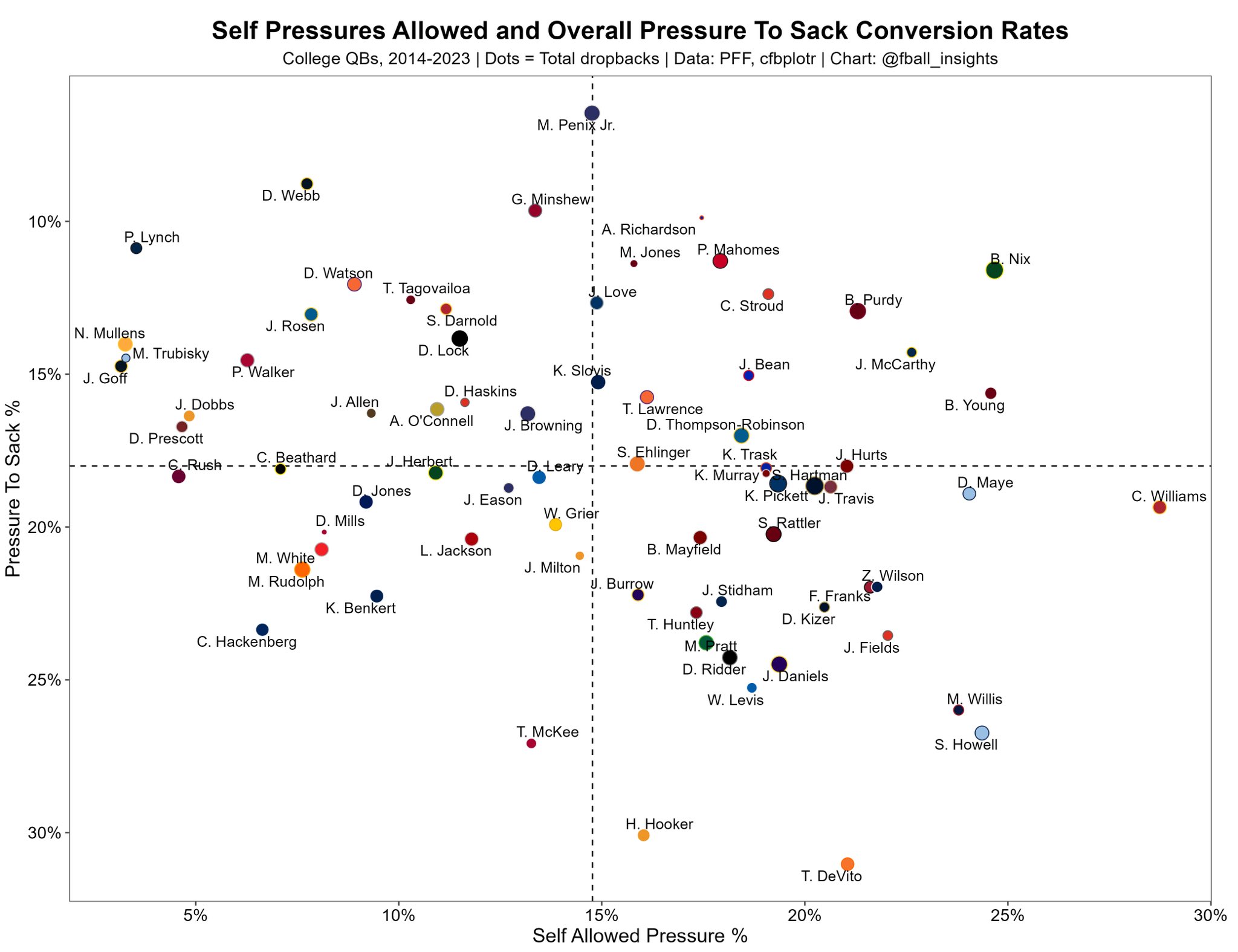 Neki már csókolómmal fognak köszönni a draft utáni rookie minicampben, ez fix. Több mint 60 meccset játszott egyetemen, fél évvel idősebb a 3 NFL szezont lejátszó Lawrence-nél, hagyok időt... Nyilván jól döntött Nix, hogy kimaxolta a college játék idejét mert most lesz legmagasabb az ázsiója, de ettől még kontextusba lehet tenni a játékát, hogy idősen túljárt a 19-20 éves védők eszén. De sajnos még ez sem teljesen igaz, mert jó játéka leginkább a rendszernek volt köszönhető, kevés olvasás, közeli célpontok, RPO-k. Auburben rossz rendszerben, fiatalon gyengén játszott, akkor mindenki eltemette ezt a státuszt sikerült javítani az Oregonban, de avatott szemnek hamar kiderül, hogy azért nem arról van szó, az isten adta tehetsége utat tört a nyugati parton.