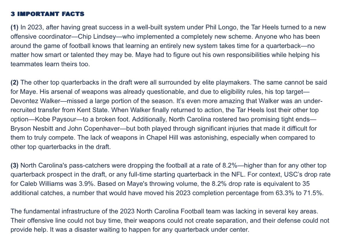 Mellé teszem Jayden Daniels-t mint prospectet és egyszerűen képtelen vagyok felfogni, hogy miért választaná bárki is előbb Danielst mint Mayet (nyilván, mert nem értek hozzá…). Szóval, sok hülyeséget látunk már a tizeniksz év alatt a draftok során, de én egyszerűen nem tudom elképzelni, hogy Maye lecsússzon az ölünkbe a harmadik helyre.