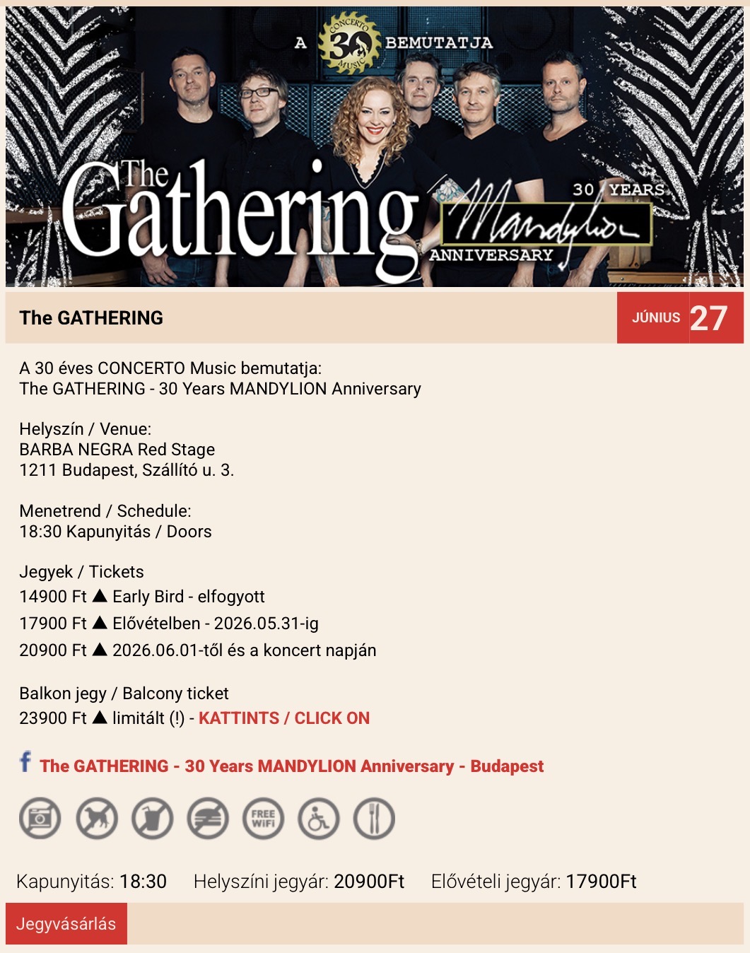 Mert nem sokan fizetnének négy-ötszörös árat a jegyekért.Jah. De ez van, majdnem minden ott van... Ahhoz 40 éves Helloween-nek kell lenni, hogy a Papp Lászlóban legyél 😅Kár hogy a Barba Negraban.Júniusban The Gathering-koncert Pesten. Az eredeti felállás, Annekével. Ha van valami, amire azt hittem, hogy már az életben nem jutok el, az ez. És jegy a zsebben. 😊Hah, és a teljes Mandylion lemezt eljátszák. Valamikor 2000, 2001 környékén voltam az E-klubban 😄